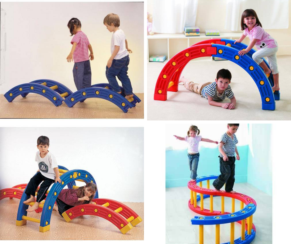 Bộ đồ chơi vòng tròn vận động đa chức năng bao gồm 4 chi tiết hình bán nguyệt màu sắc bắt mắt, có thể tháo lắp ghép thành các hình tròn, hình cầu vòng, ziczac, bập bênh giúp tăng cường sức khỏe, sự dẻo dai và khéo léo cho trẻ với các trò chơi leo núi, đi thăng bằng…